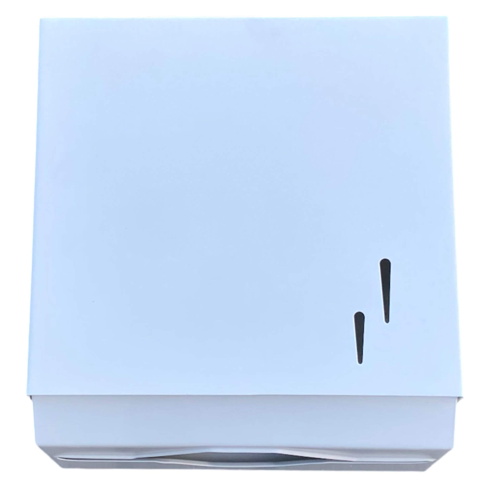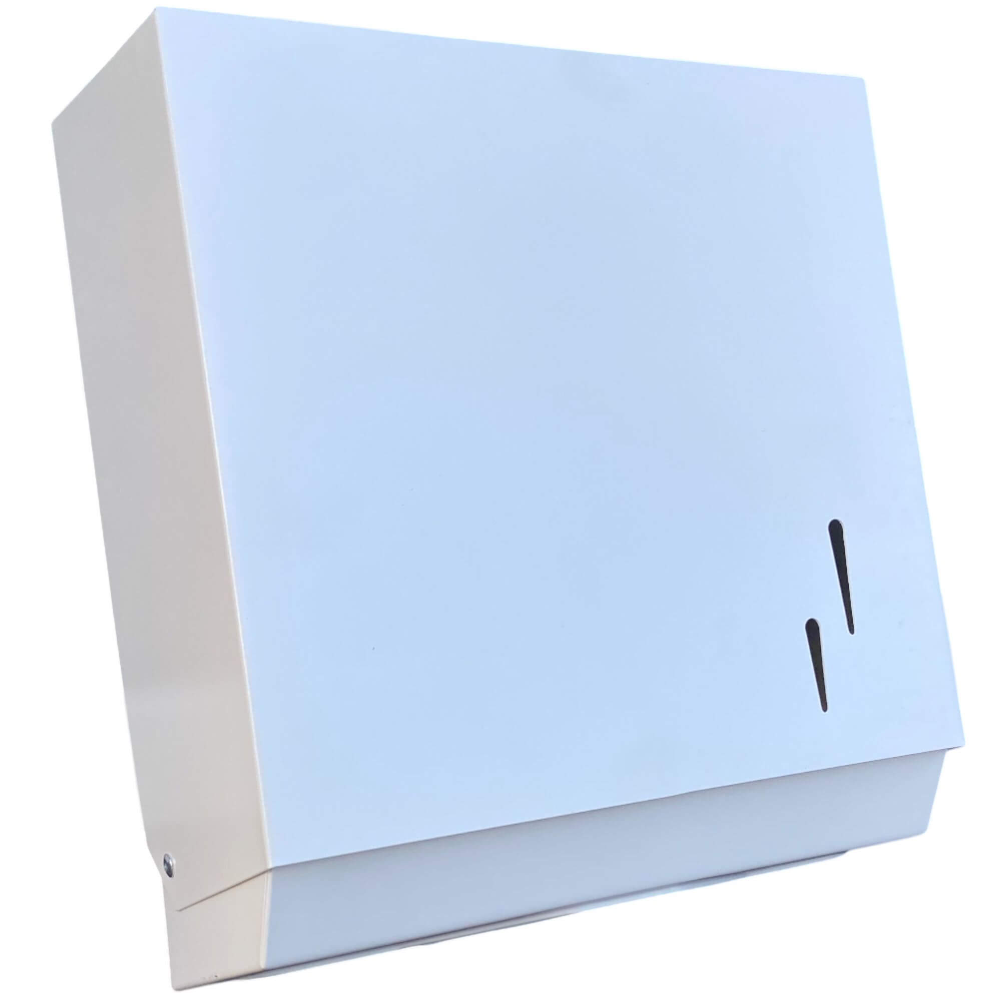 Nowoczesny wysokiej jakości stalowy w białym kolorze pojemnik na ręczniki papierowe składane ZZ. Ręczne wyciągnięcie jednego ręcznika powoduje wysunięcie następnego. Pojemnik wykonany z stali nierdzewnej 403 malowanej. Posiada okienko do kontroli ilości ręczników w pojemniku Zamykany na kluczyk. Montowany do ściany za pomocą kołków rozporowych (w zestawie). Dozownik produkowany na terenie Unii Europejskiej