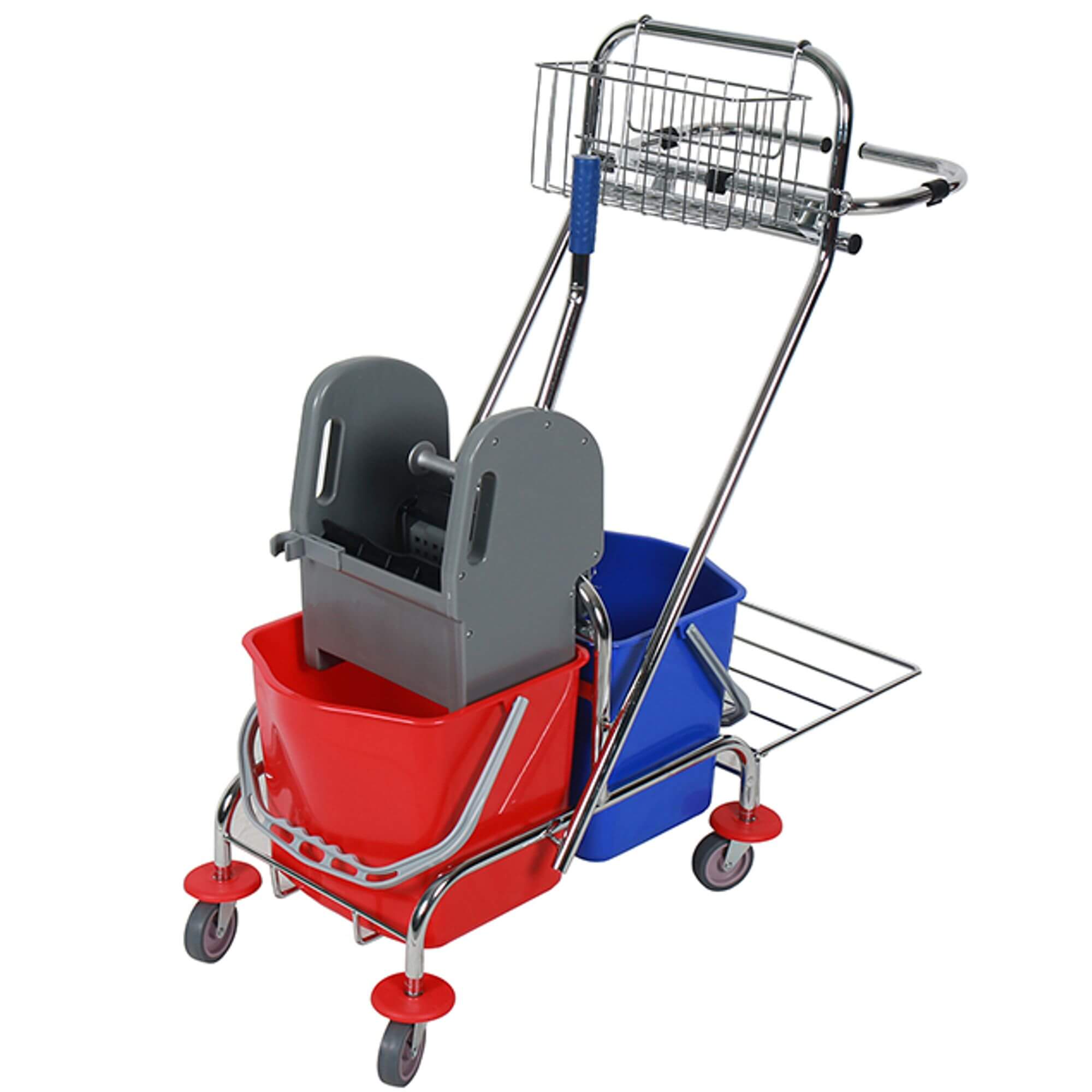 deClean Wózek do Sprzątania CHROM Wiadra 2x17 litrów + Prasa, Koszyk, Uchwyt HS337