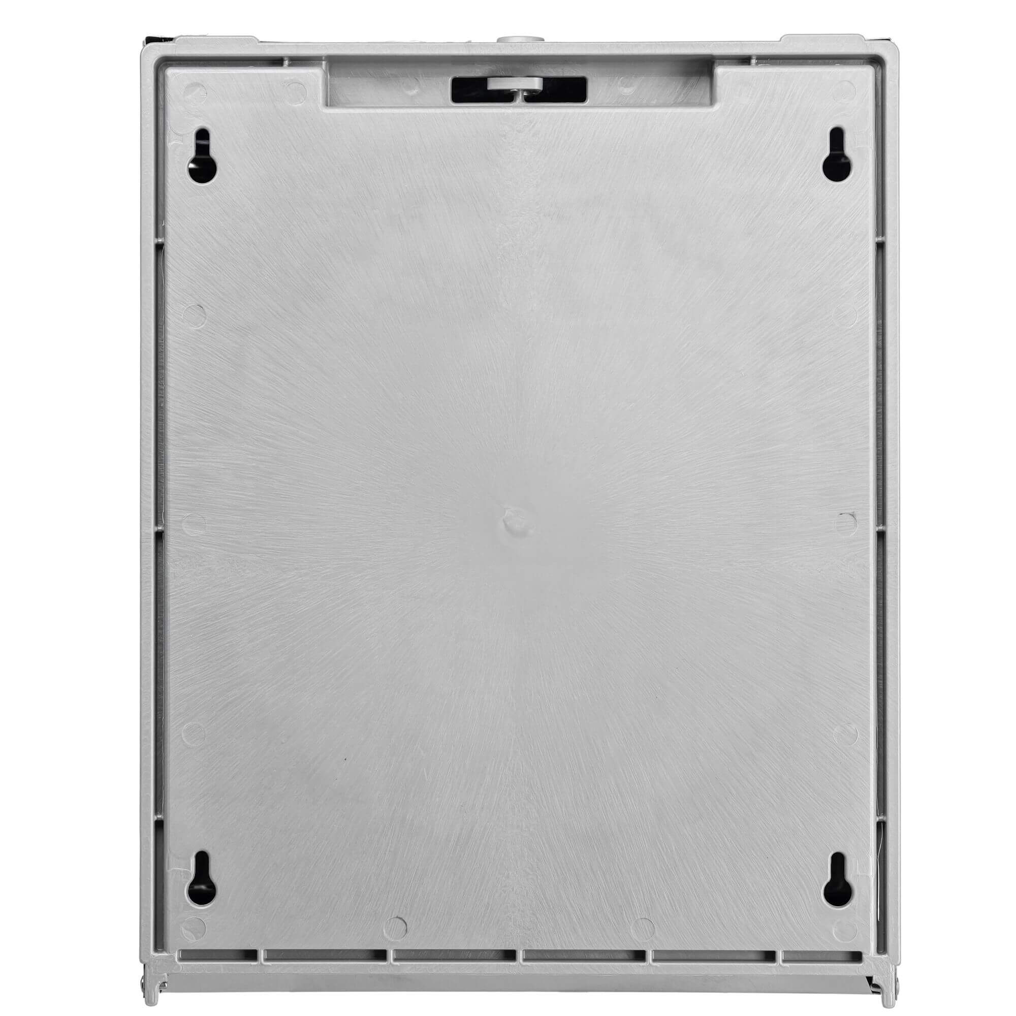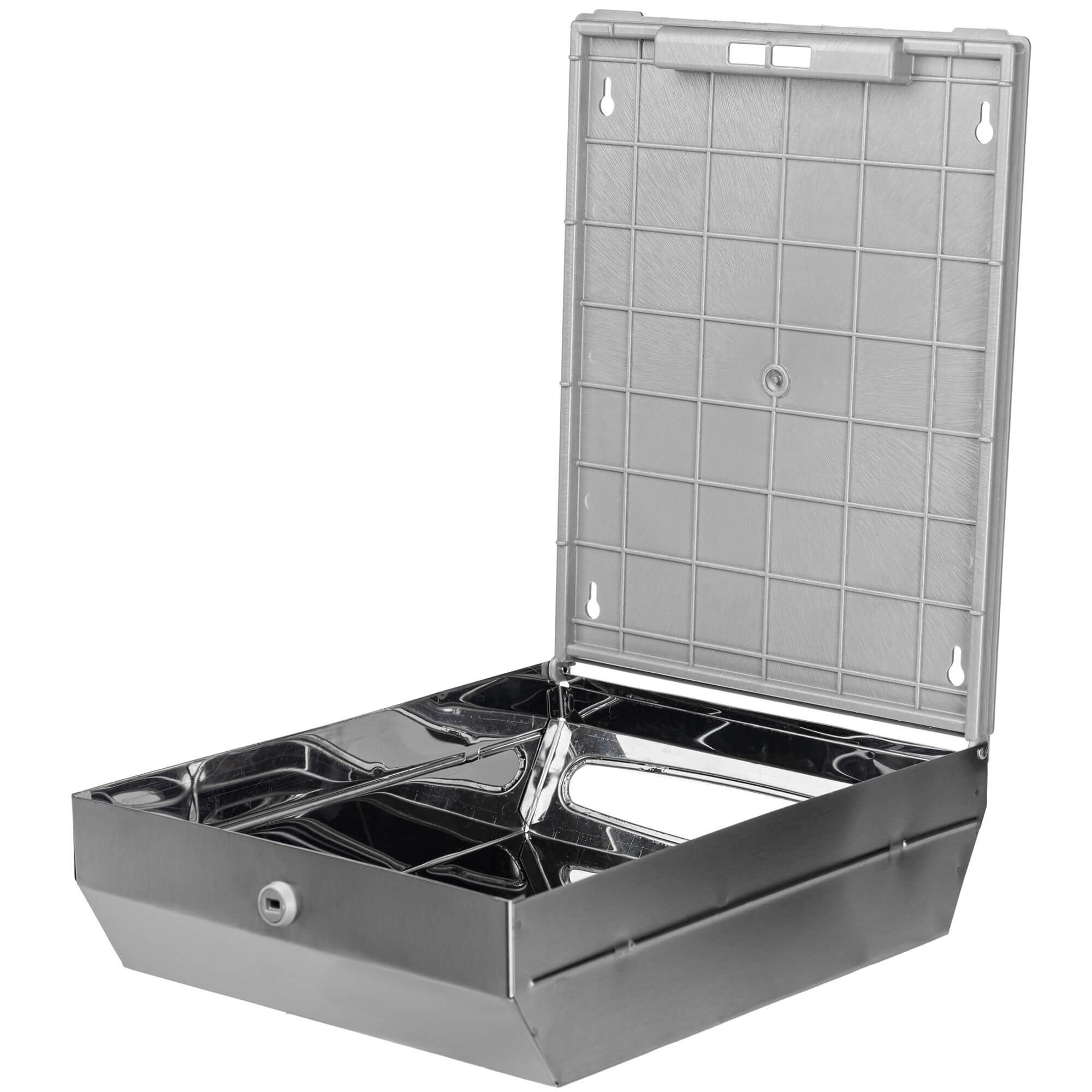Nowoczesny stalowy w odcieni półmatowej pojemnik na ręczniki papierowe składane ZZ. Ręczne wyciągnięcie jednego ręcznika powoduje wysunięcie następnego. Pojemnik wykonany z stali nierdzewnej Posiada okienko do kontroli ilości ręczników w pojemniku Zamykany na kluczyk. Montowany do ściany za pomocą kołków rozporowych (w zestawie)