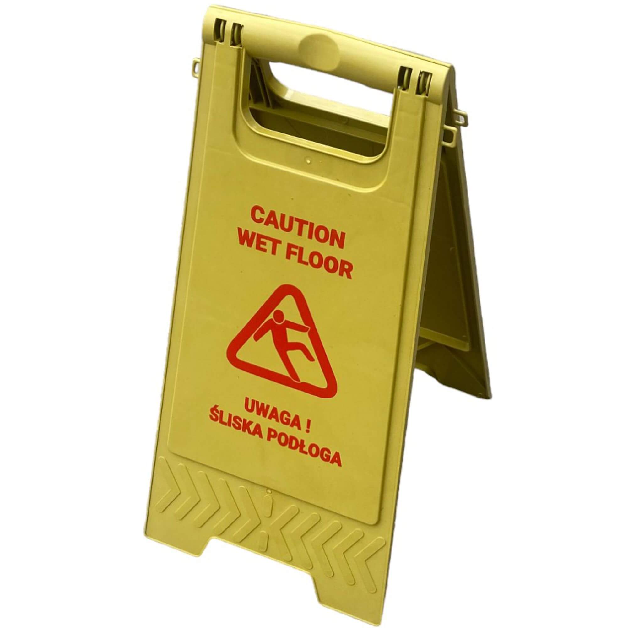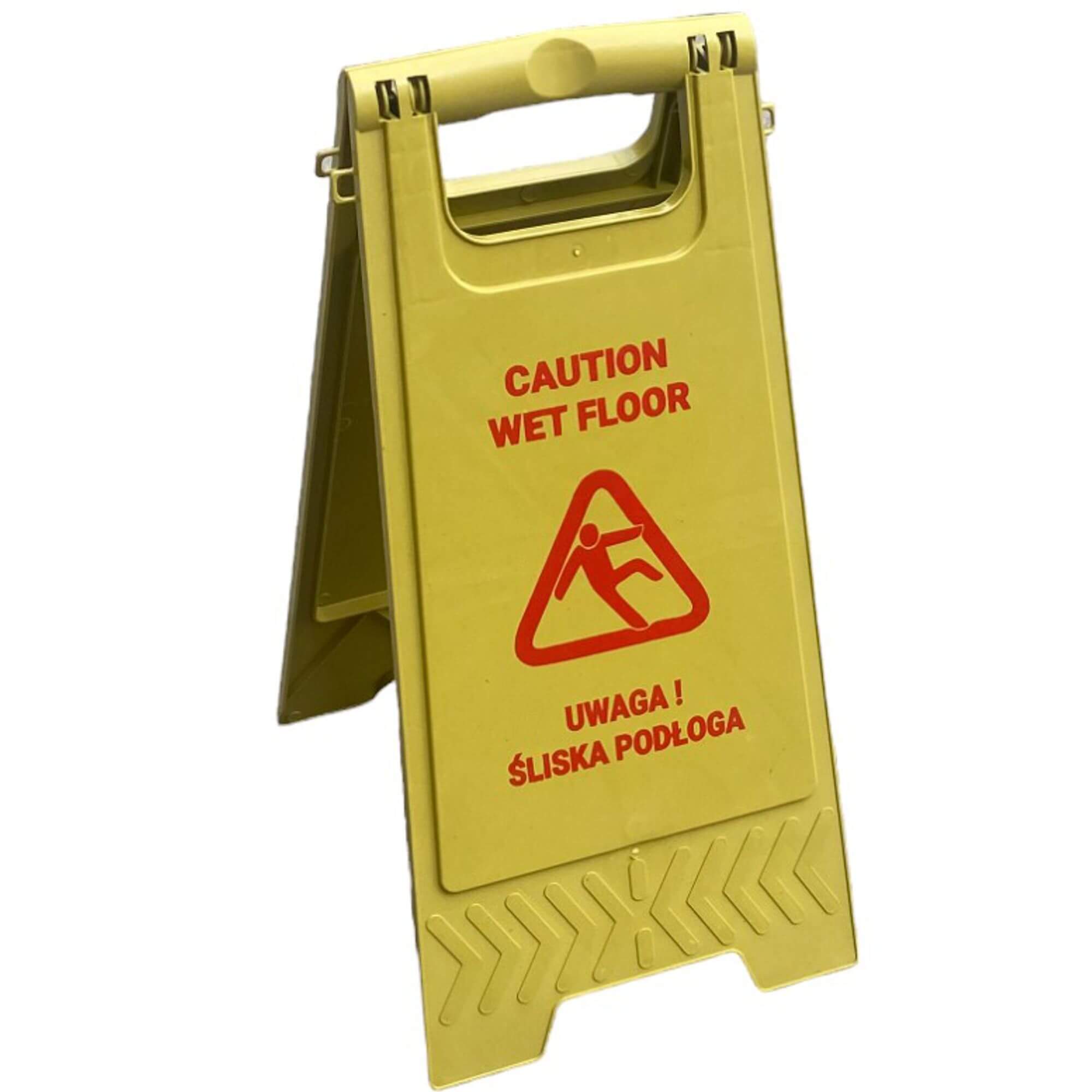 Żółta tablica ostrzegawcza z napisem w języku polskim i angielskim stanowi element wyposażenia niezbędny w każdym większym obiekcie użyteczności publicznej.
