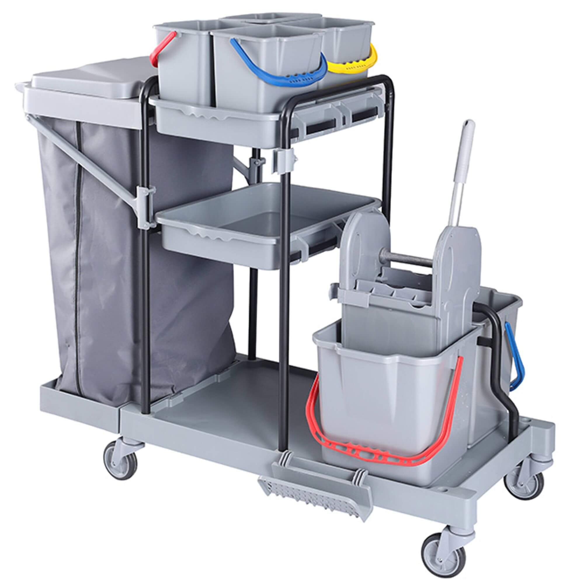 Wózki wykonane są z trwałych materiałów (PP, ABS, stal nierdzewna), odpornych na środki chemiczne i intensywną eksploatację. Idealne do sprzątania dużych powierzchni w obiektach komercyjnych i przemysłowych.